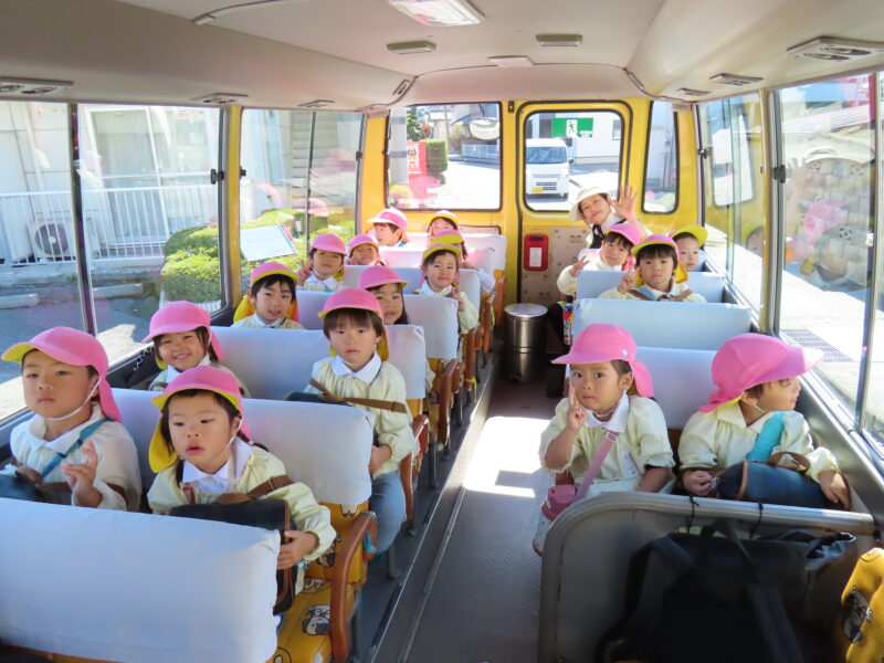 初めて園バスに乗る子かほとんどで、座席に座っただけで笑顔がこぼれます。出発時には事務の丸山先生が素敵なお面とともにお見送りをしてくださいました。車内は爆笑の渦!さらに笑顔にしてもらった子ども達でした。