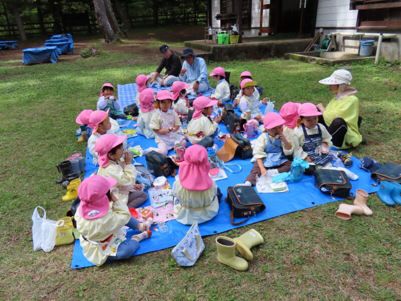 自由遊びを終えると待ちに待ったお昼の時間です。「鮭と、ふりかけ!」「昆布だよ♪」「デザートは…ぶどう!」お山で食べるお昼ご飯はまた格別で「美味しー♡」が溢れていました。