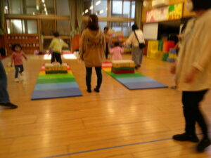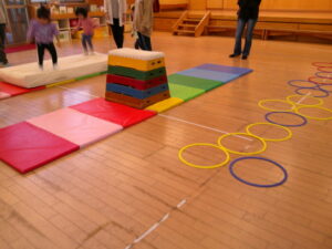 マットに跳び箱を置いたり、エバーマットを置いたり、リングを置いてたくさんジャンプをしました。