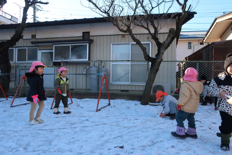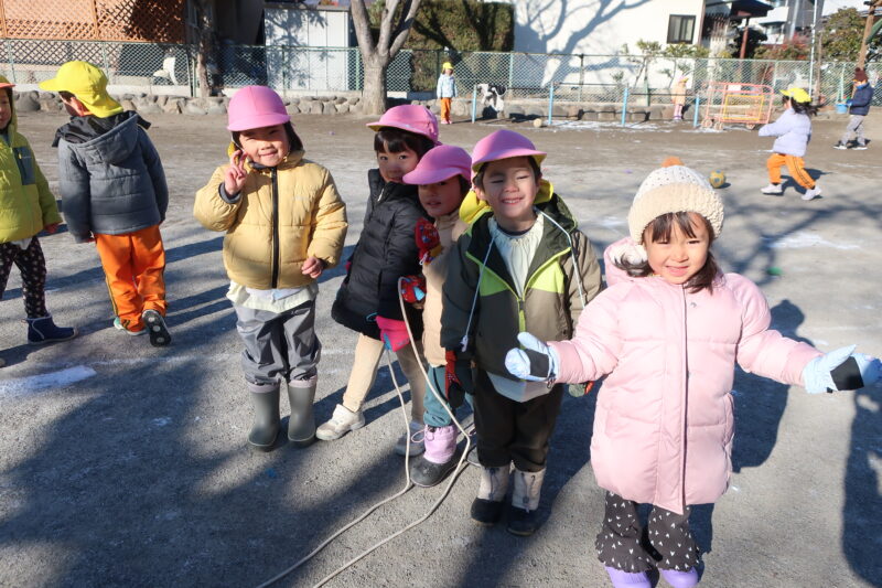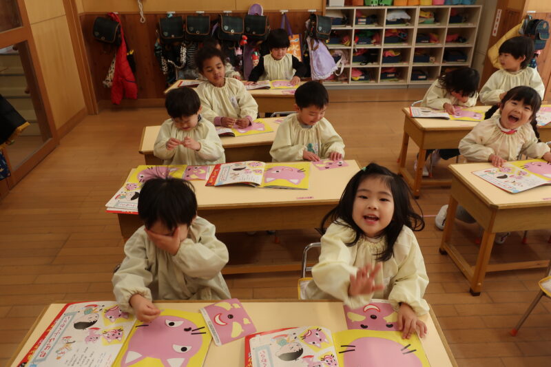 みんなで面白い顔をしたり、ふくわらいのシールをしたりと楽しみました。ふくわらいは、2学期の終業式で園長先生がみんなの前で披露してくれたこともあり、やり方のイメージが膨らみ、みんな自分の手で目を隠し楽しんでいました。その後、園長先生が通りかかると、「園長先生~見て見て~!」と、自分がやったふくわらいを見せていましたよ。