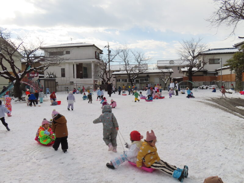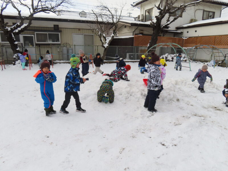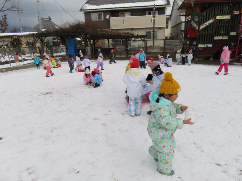 昨日の雪が園庭に積もり、今日は良い天気の中で雪遊びを楽しんだ子ども達です!