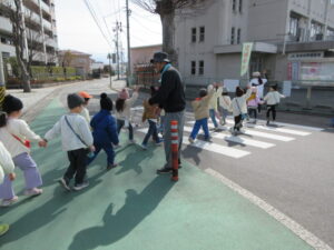 小学校へ行ってきました!! 2026-02-24 今日は小学校へ見学に行ってきました。 みんなで歩いて芹田小学校へ。 教頭先生が出てきてくださり、校内も案内してくれました。 交通ルールも確認しながら。 今週は、南部小学校へも行く予定の年長さんです。