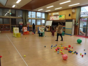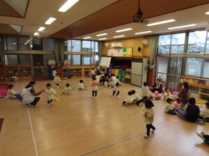 前半は、ちゅうりっぷのお友達と遊び、後半は、リズム体操・コンコンくしゃんの歌を歌ったり、絵本を見たり、ボール活動をして体を動かしました。